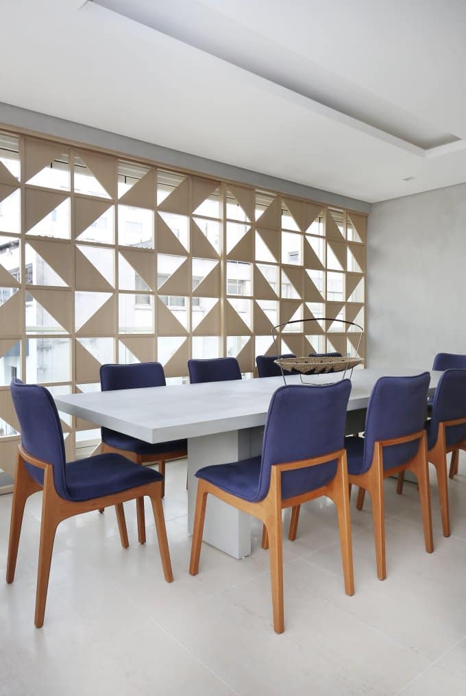Face au problème épineux du vis-à-vis, le bureau MAB3, épaulé par Mmagalhães Studio, a imaginé un panneau de bois sculpté pour préserver l’intimité de la salle à manger sans priver l’espace de lumière. Ce clin d’œil au muxarabi, héritage de l’architecture arabe, combine trois vantaux coulissants en freijó, chacun découpé au laser pour alléger l’ensemble. Les panneaux s’ouvrent quand la vue le permet, puis s’escamotent le long de rails encastrés, effaçant la proximité oppressante des bâtiments voisins sans sacrifier la clarté ni la circulation de l’air.