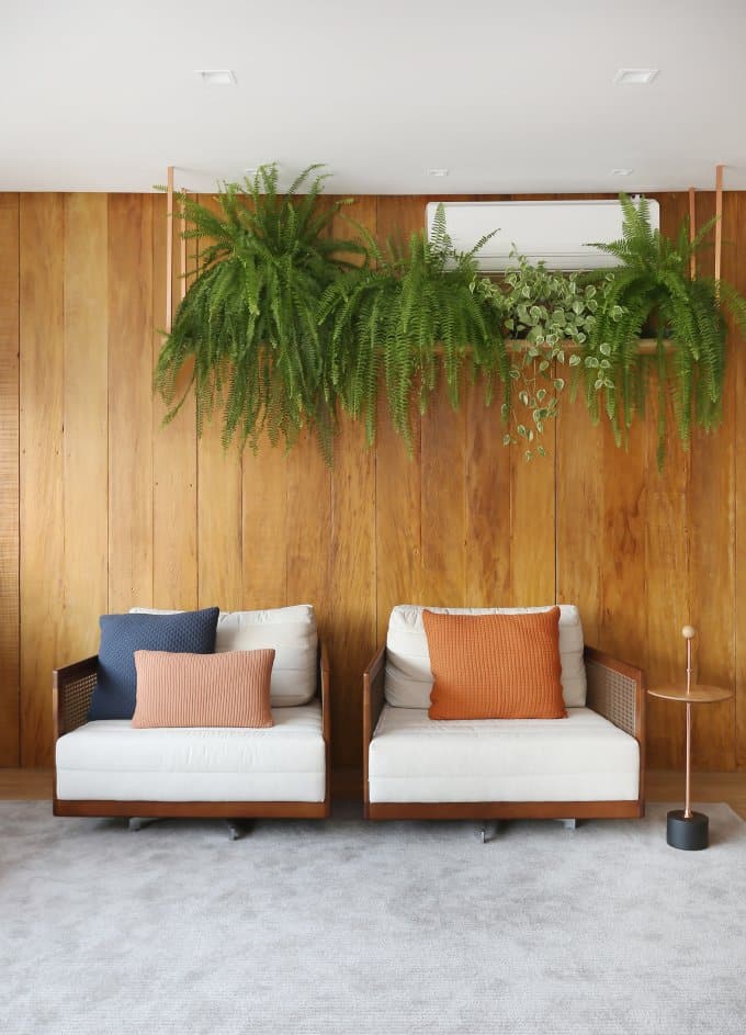 La demande de nature à domicile ne cesse de croître. Dans cet appartement, l’équipe de l’atelier 11.11 et l’architecte Ligia Kalil ont joué la carte du vert jusque sur le balcon. Au-dessus du coin lecture, des pots suspendus dans une niche, maintenus par des tiges en fer cuivré, masquent partiellement un appareil de climatisation prêt à tourner à plein régime lors des journées chaudes. L’appareil s’efface derrière des fougères et des piments d’ornement, soigneusement sélectionnés pour leur résistance à la mi-ombre. Comme le souligne l’architecte Nadja Bonan, ces plantes s’adaptent bien à l’intérieur. En cas de canicule où la clim fonctionne sans relâche, rien n’empêche de remplacer temporairement les végétaux par des objets déco.