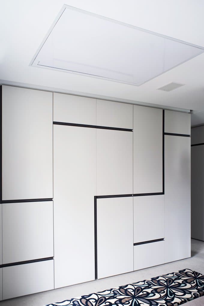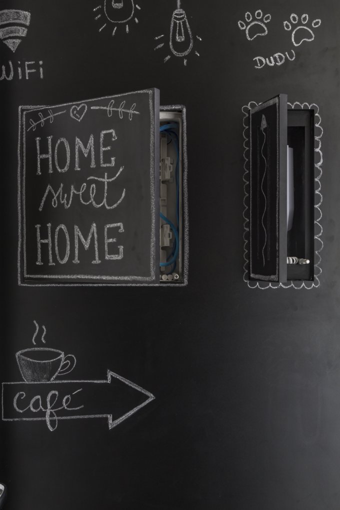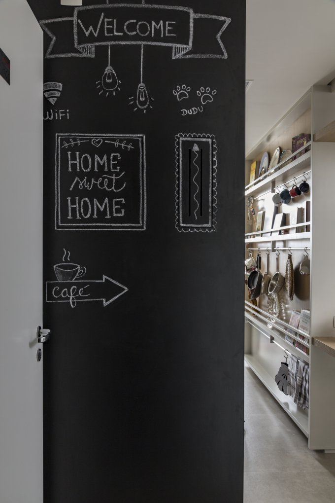 Dans un logement où la structure ne permettait pas de modifier les murs porteurs, Daniele Okuhara et Beatriz Ottaiano (architecture doob) ont détourné la contrainte en inventant un panneau astucieux, habillé d’un stratifié façon tableau noir. Réalisé par Sasdelli Woodwork, ce panneau recèle deux petites portes à ouverture discrète, sans poignée, d’une simple pression. Derrière, ni le tableau électrique ni l’interphone n’encombrent la vue : ils restent accessibles, mais invisibles, pour préserver la pureté du hall d’entrée.